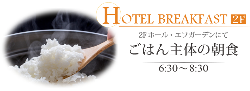 「朝食付きプラン」にてご宿泊のお客様には、1Fカフェラウンジ モンシェリーにて『洋朝食』、または、2F ホール・エフガーデンにて『ごはん主体の朝食』をお選びいただけます。